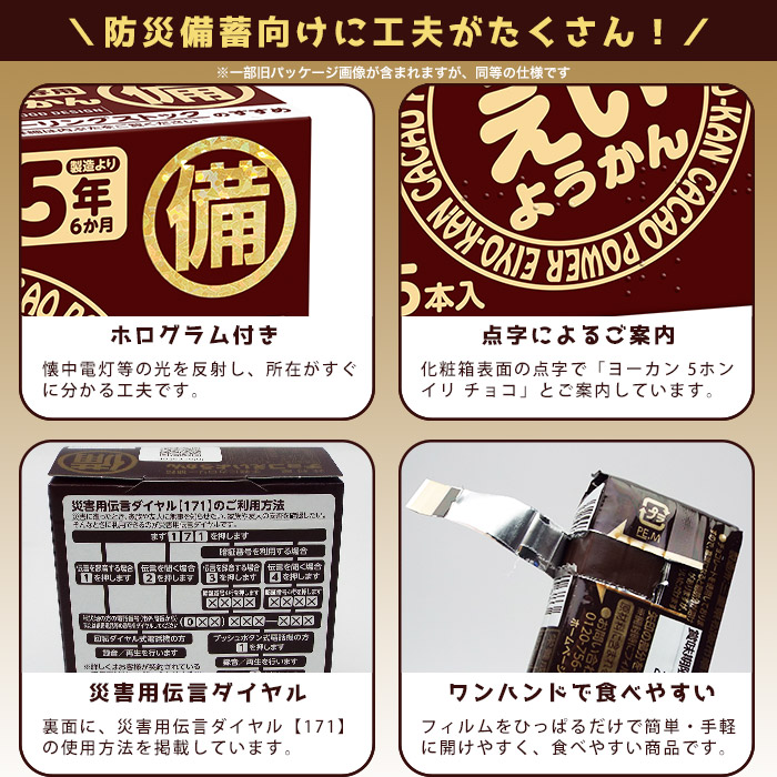 1本1本を気密性の高いフィルムでパックし、製造後5年半の長期保存を可能にしました。 素朴な甘さで腹持ちの良い羊羹は、疲れた体と心を支える貴重な食料となります。