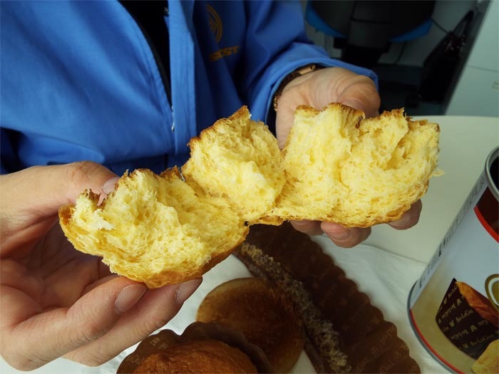 | 食感 | ギュッと、しっかり。何層もの生地を重ねて作られているそうですが、ふわふわではなく、ギュッと詰まっています。 |