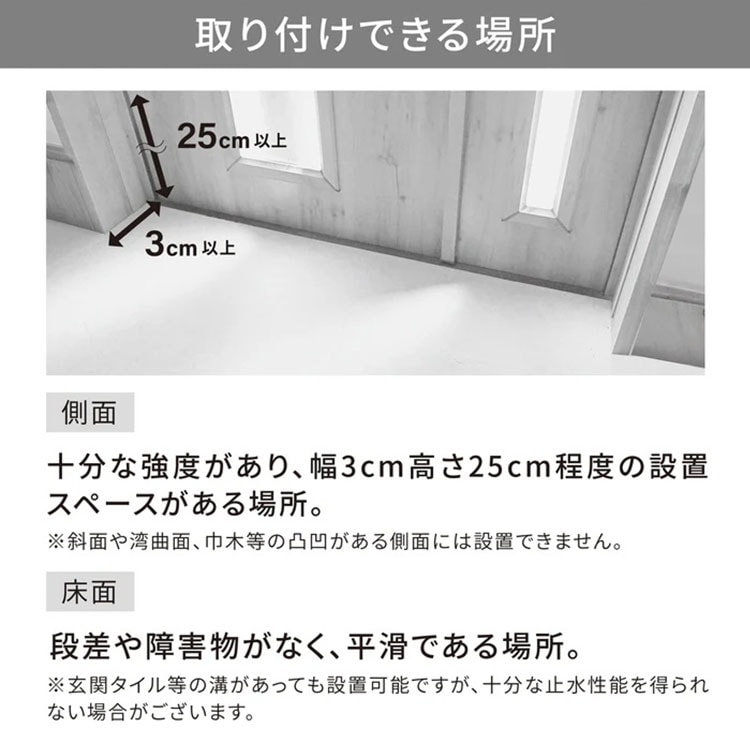| 取付のできる場所 | 【側面】十分な強度があり、幅3cm、高さ25cm程度の設置スペースがある場所 ※斜面や湾曲面、巾木等の凸凹のある側面には設置できません。 【床面】段差や障害物がなく、平滑である場所 ※玄関タイル等の溝があっても設置可能ですが、十分な止水性能を得られない場合がございます。 |